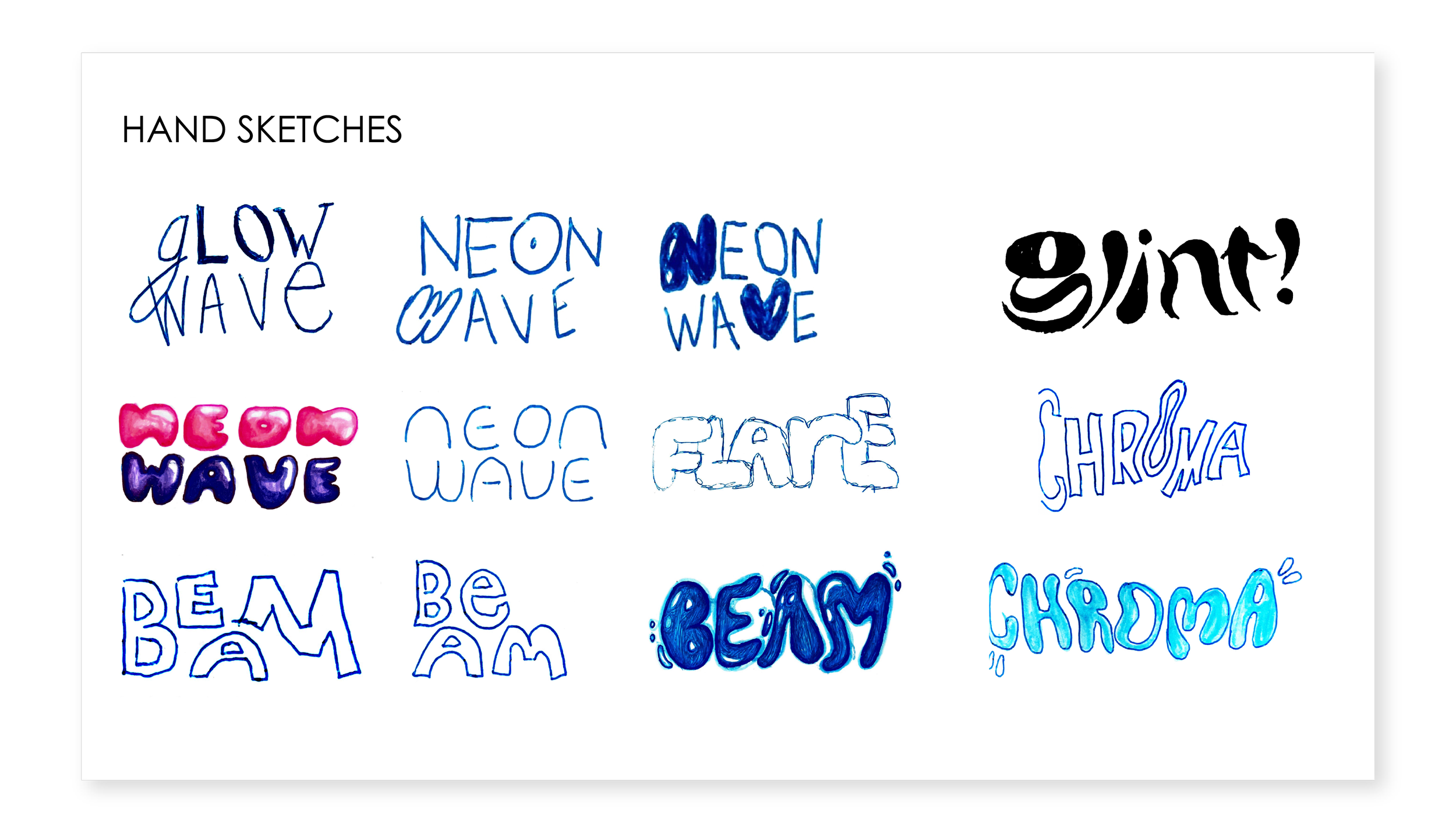 I spent a lot of time playing around with names for this project as well as flavor names. The final names were created and chosen to be on topic for the festival of art and light. This theme was considered all the way down to the flavor descriptions on each can. Their witty nature help bring a lighthearted energy to the brand.