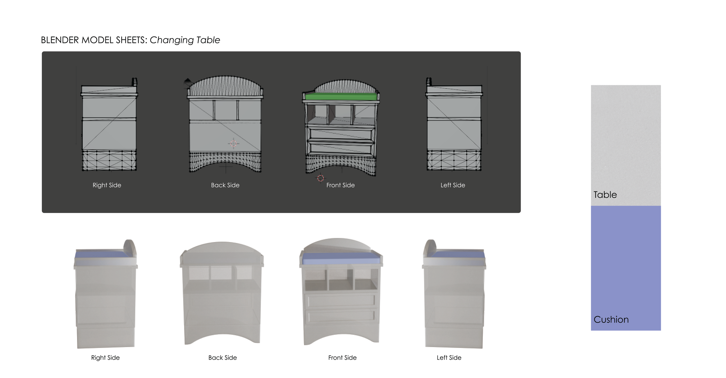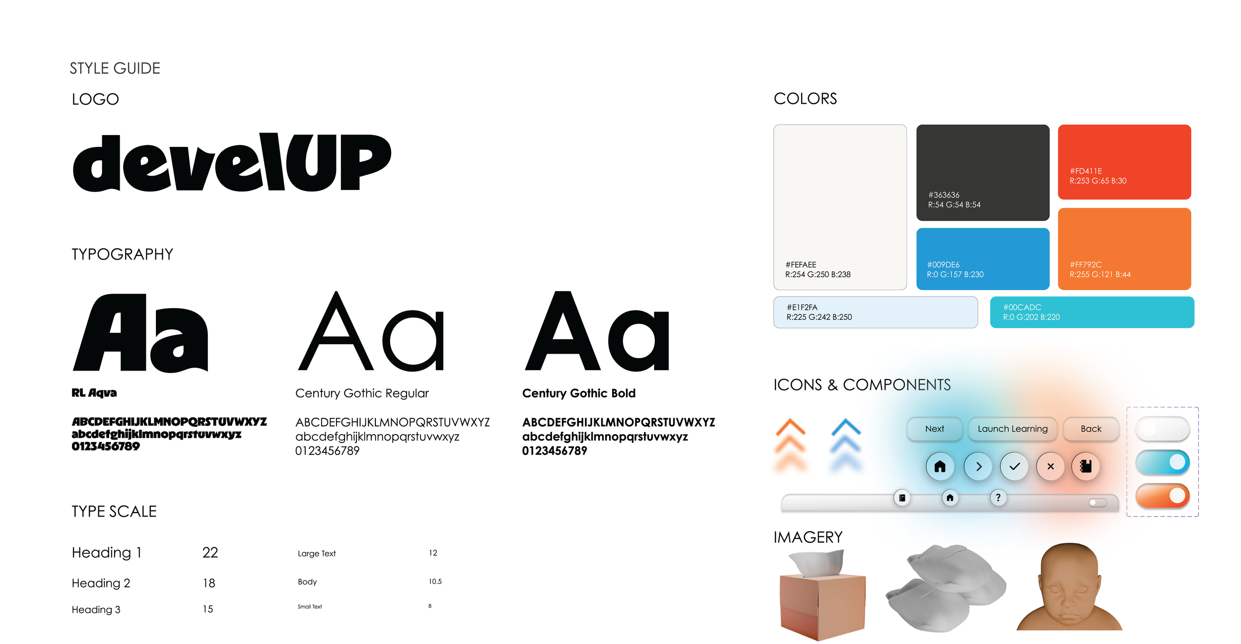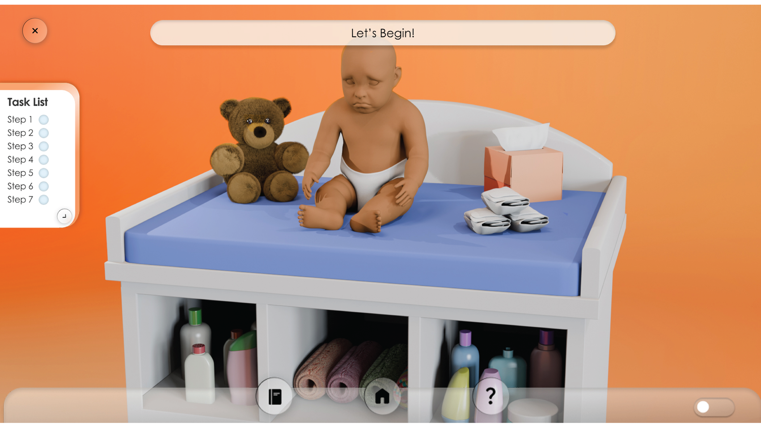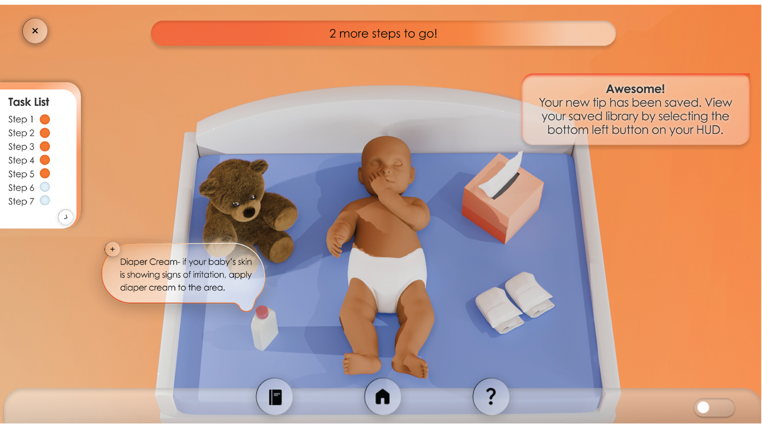 Creating the visuals for develUP comprised of two parts: 2D elements and 3D elements. Our 2D elements were designed intentionally, for ease of understanding, calming effects, and gender neutral style. Then we jumped on in with 3D modeling one of our tasks, which included a changing table and baby. With the use of free models, we designed our 3D figures and scene in a calming gradient atmosphere. The goal here was to immerse the user into the task and leave all other stresses behind.