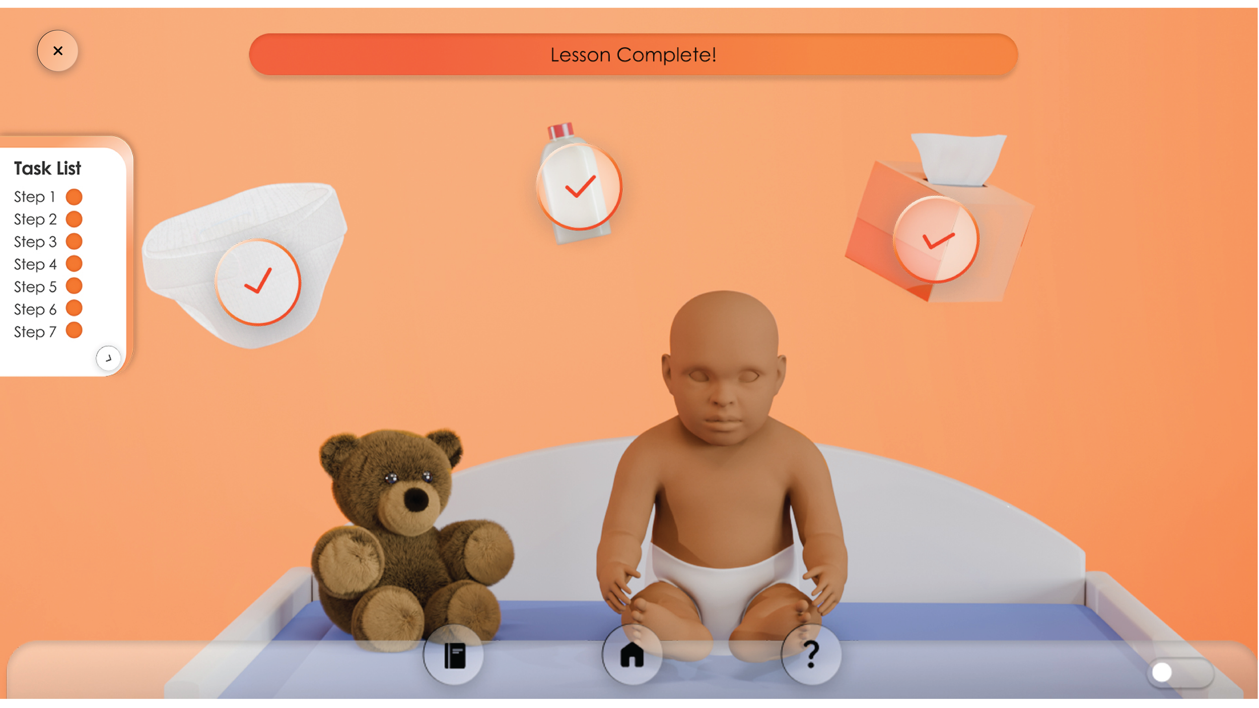 Within our baby form, I rigged the body and face to reflect the action steps in our highlighted task. Poses included laying down and sitting up with leg and arm movements. Through facial rigging, the baby begins the scene upset then ends the scene happy and content. We finalized our scenes by superimposing our 2D UI elements on top of our 3D rendered scenes.
