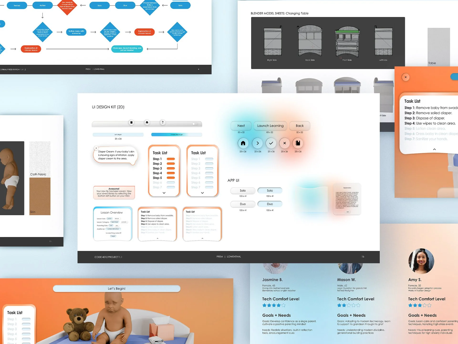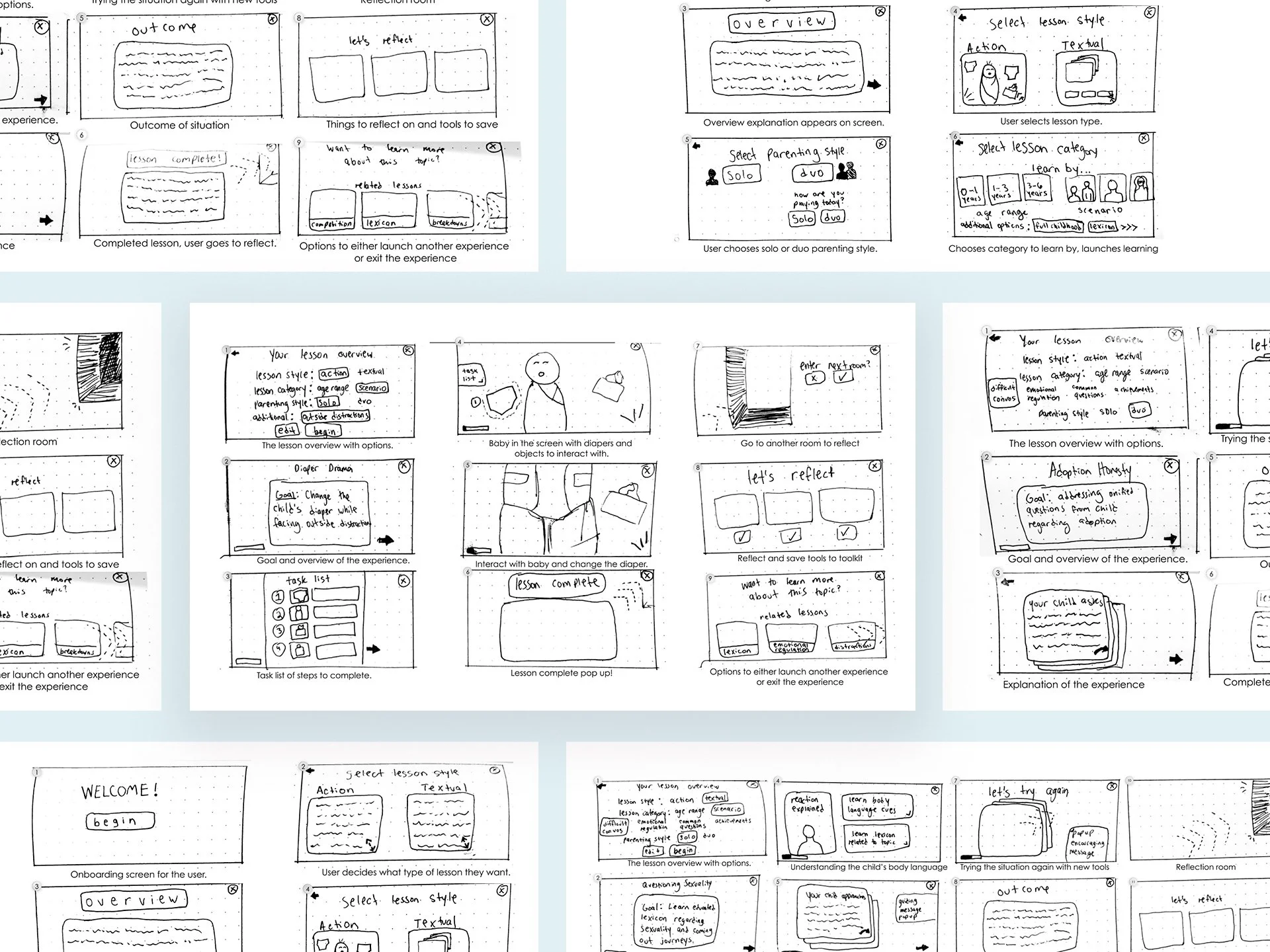 This project began with research exploration including video game benchmarking, competitor analyses, and the study of research articles regarding parenthood’s impact on confidence and stress. This step gave us insight to areas that current parenting platforms are missing the mark on and how they are doing well. Through several research articles sourced from The National Library of Medicine, we learned more about the emotional impact of parenting on varying levels.