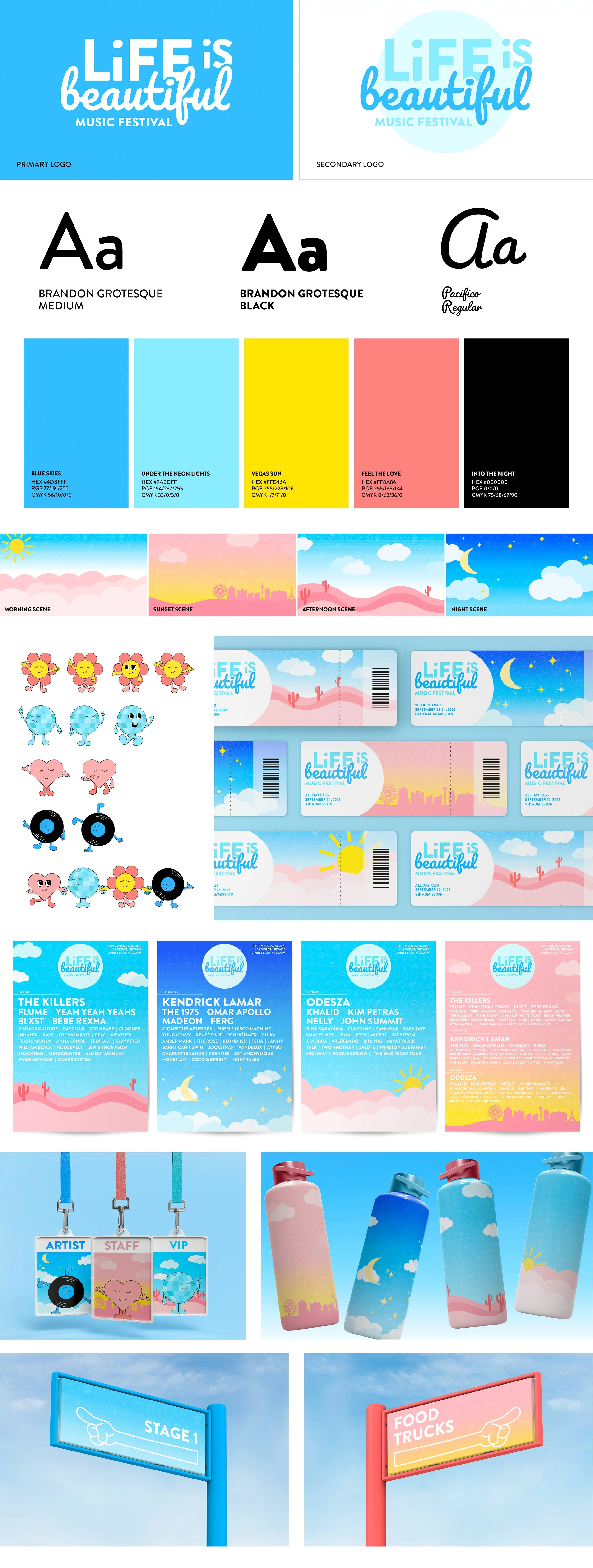 Overview: My festival of choice was Life is Beautiful, a high energy music, food, and art festival based in Las Vegas, Nevada. The festival name alone caught my eye and got me interested in exploring their current brand identity. The main goal for my redesign was to play off of that naming identity and make things all around more dreamy and uplifting.